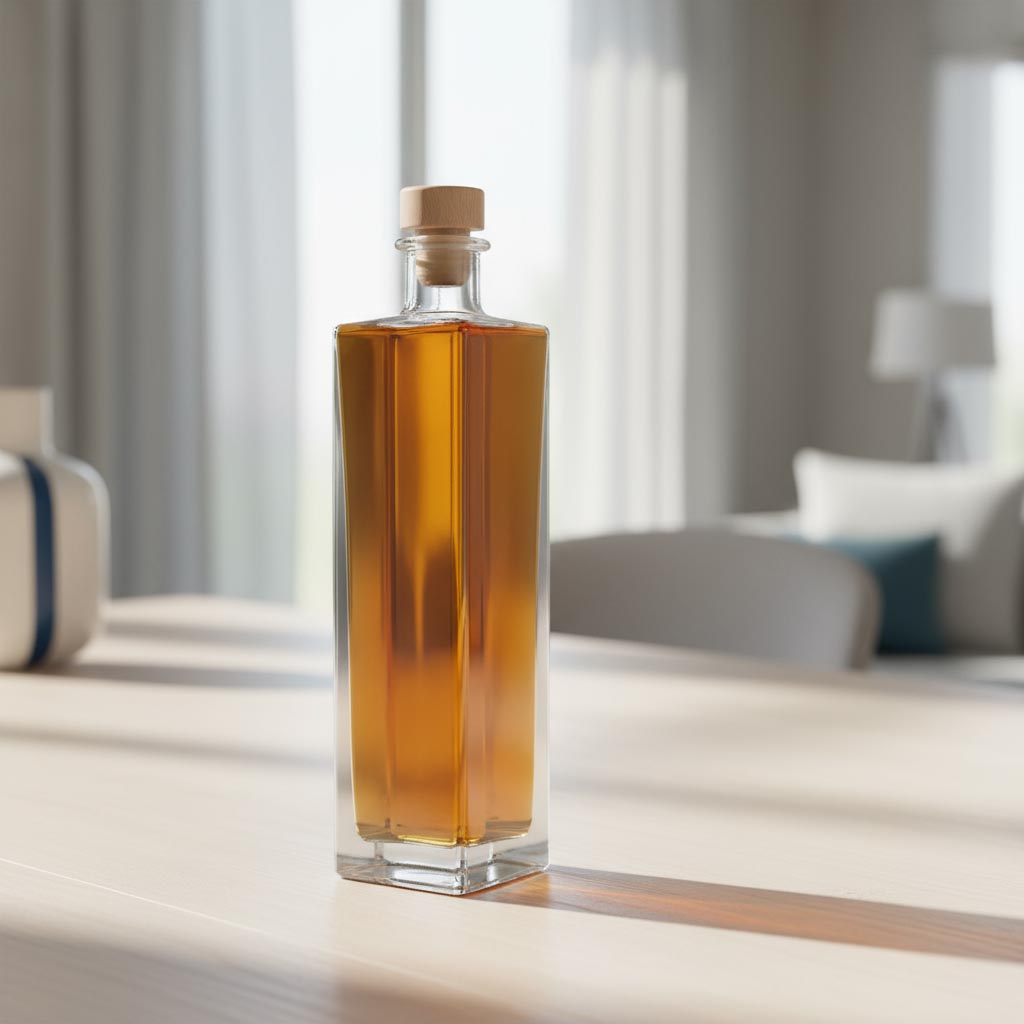 A série de produtos "Garrafa Quadrada" da Flaschenland inclui garrafas de vidro de alta qualidade de 500 ml com design quadrado e um bocal prático em cortiça. Estas garrafas de vidro destacam-se pela sua versatilidade e construção robusta. As garrafas da série "Rafaello" são fabricadas em vidro resistente, que é resistente ao frio, ao calor, próprio para micro-ondas, forno e máquina de lavar louça. Com o seu formato quadrado e compacto e uma capacidade de 500 ml, oferecem opções ótimas para armazenamento e apresentação. O bocal em cortiça assegura um fecho seguro e elegante, ideal para licores, bebidas espirituosas e aguardentes. O design em vidro transparente mantém o conteúdo sempre visível, tornando a garrafa especialmente atraente para uso decorativo.