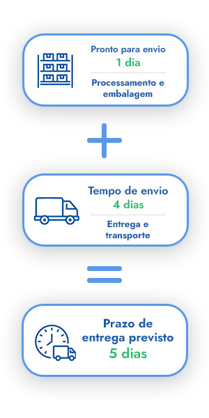 «Pronto para envio» refere-se ao tempo que a nossa empresa necessita para processar a sua encomenda e prepará-la para envio. Este período começa com a receção da sua encomenda e termina assim que a sua encomenda estiver pronta para ser recolhida pelo serviço de entregas.