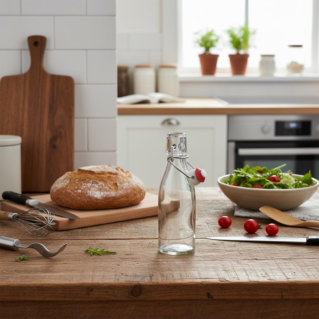 'Paul' é uma garrafa de vidro transparente de 200 ml com uma elegante forma retro, adequada para o enchimento de óleos, bebidas espirituosas e outros produtos. É compatível com fecho de mola, resistente ao frio e ao calor, e pode ser lavada na máquina de lavar loiça, usada no micro-ondas e no forno.